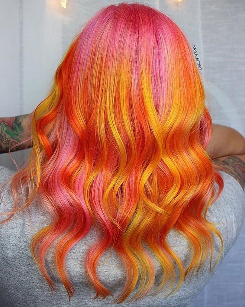Kayla Boyer, Minnesota-based hair colorist, achieves the look by layering pink, orange and yellow dye to create a multicolored neon ombré – truly a perfect translation of our favorite fruit-flavored squares.