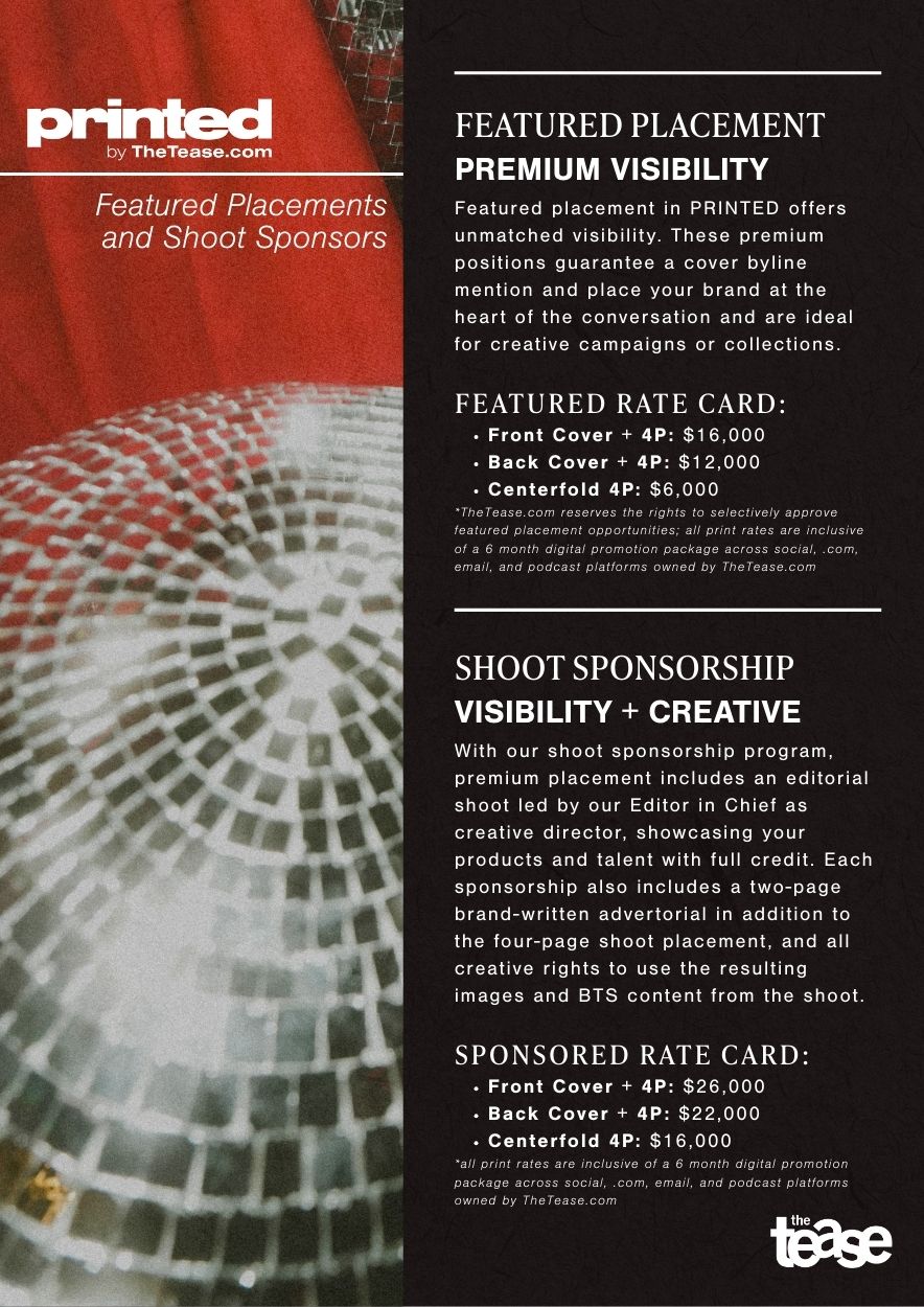 Thank you for your interest in PRINTED by TheTease.com! We’re excited to see so much enthusiasm for our upcoming Winter/Spring edition. To help us manage submissions and provide the best experience possible, we’ve outlined package options below. Please review carefully and submit your materials using this form.