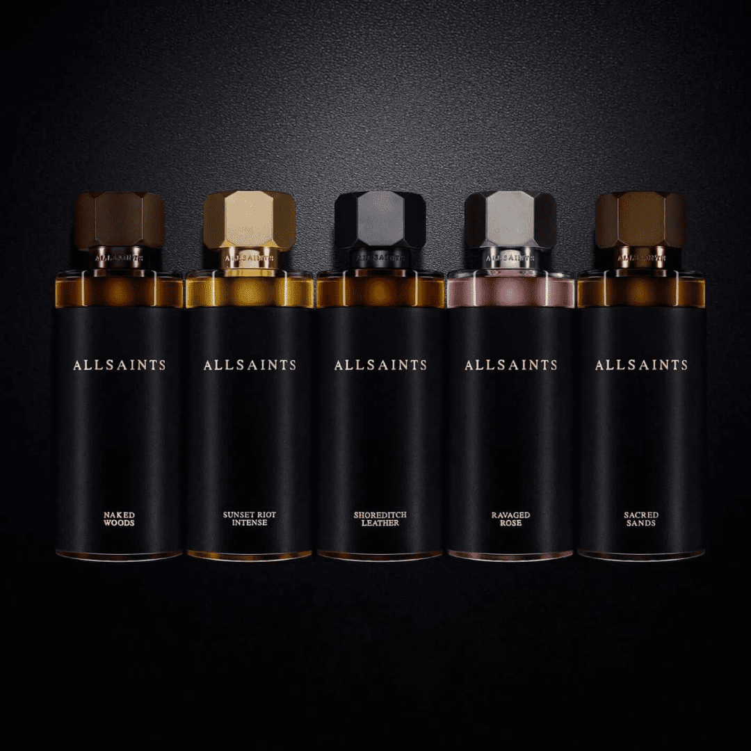 The fragrance line is entirely unisex (a natural extension of the brand’s overall aesthetic ethos) and is composed of five distinct scent profiles designed to stand alone as signature scents or be layered for personalization. Each one feels conceptually aligned with the AllSaints universe: Naked Woods leans raw and woody, Sunset Riot Intense is warm and addictive, Shoreditch Leather channels that primal leather identity the brand is known for, and Ravaged Rose feels like florals for someone whose bridal vision includes a leather jacket.