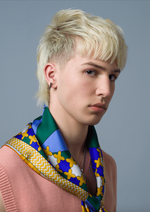 A modern mullet hairstyle with blond hair that’s styled with its natural wavy texture and enhanced by a taper fade on the sides. This trendy and versatile look has the retro appeal of the mullet but with a contemporary twist.