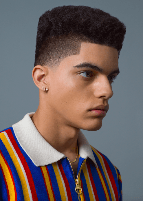 This high-top hairstyle with a tapered fade pays homage to the iconic trends of the ‘90s. It features a voluminous and structured high top, reminiscent of bold and gravity-defying vintage styles, embracing nostalgia while maintaining a fresh and fashionable aesthetic.