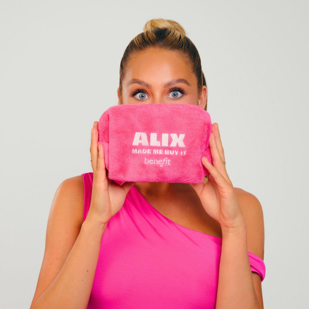 Alix designed an exclusive, limited-edition gift with purchase in collaboration with Benefit. To get the “Alix Made Me Buy It” Terry cloth makeup bag and oversize pink GRWM hair clips, all you have to do is spend $60 on any Benefit products — not limited to her faves! — in-store at Ulta or on Ulta.com. These gifts with purchase are only available from 8/13 – 9/9, so run don’t walk to get yours before they’re gone.