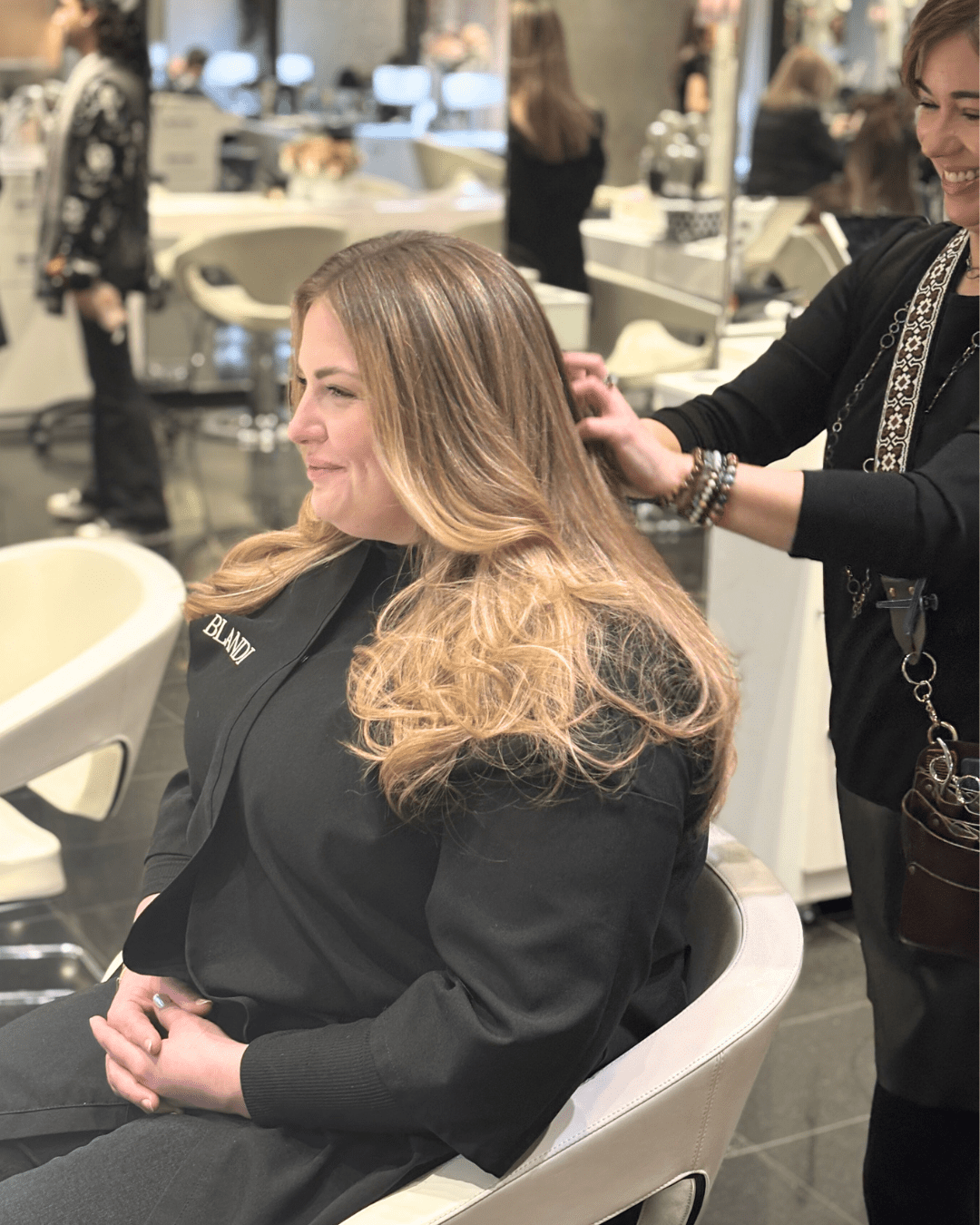 The Blandi Salon sits on the Plaza’s second floor, behind gilded doors and a mirrored elevator that opens into a marble ballroom. Inside, the Blandi team, Small Wonder CEO Stephanie Farsht, and Zion from ExitOne Solutions greeted us before Samantha’s hair journey began.