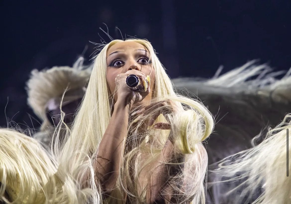 Doja Cat isn’t playing around. For her electrifying headlining Coachella performance, the first by a woman rapper and 2nd by a Black woman in the festival’s history, she blasted through nearly two dozen songs and half a dozen wardrobe changes. When it came to performing her smash hit “Demons,” Doja wore a shocking, custom “hair costume” in the same shade as her knee-grazing platinum blonde wig, flanked by 22 dancers in fuller coverage costumes by visionary hairstylist and headpiece designer Charlie Le Mindu.