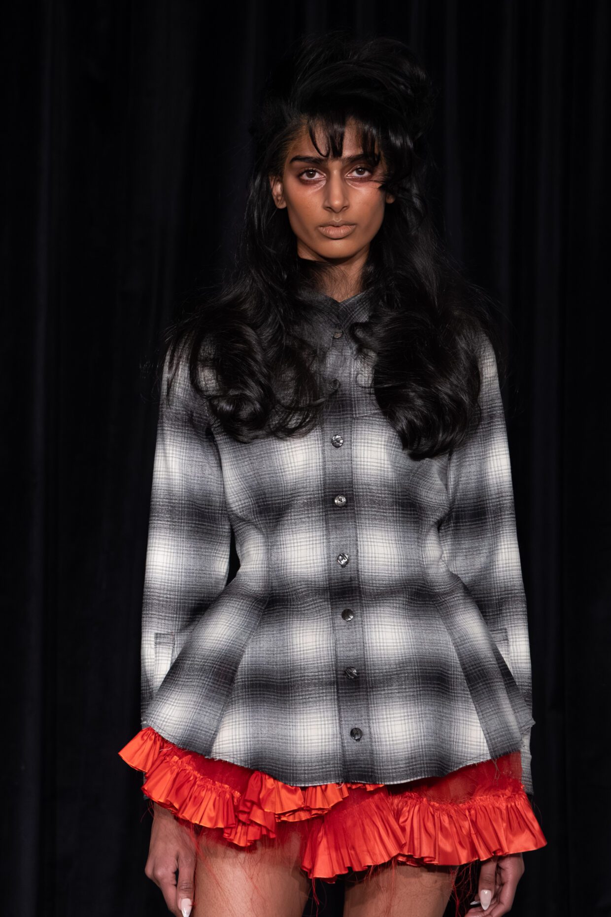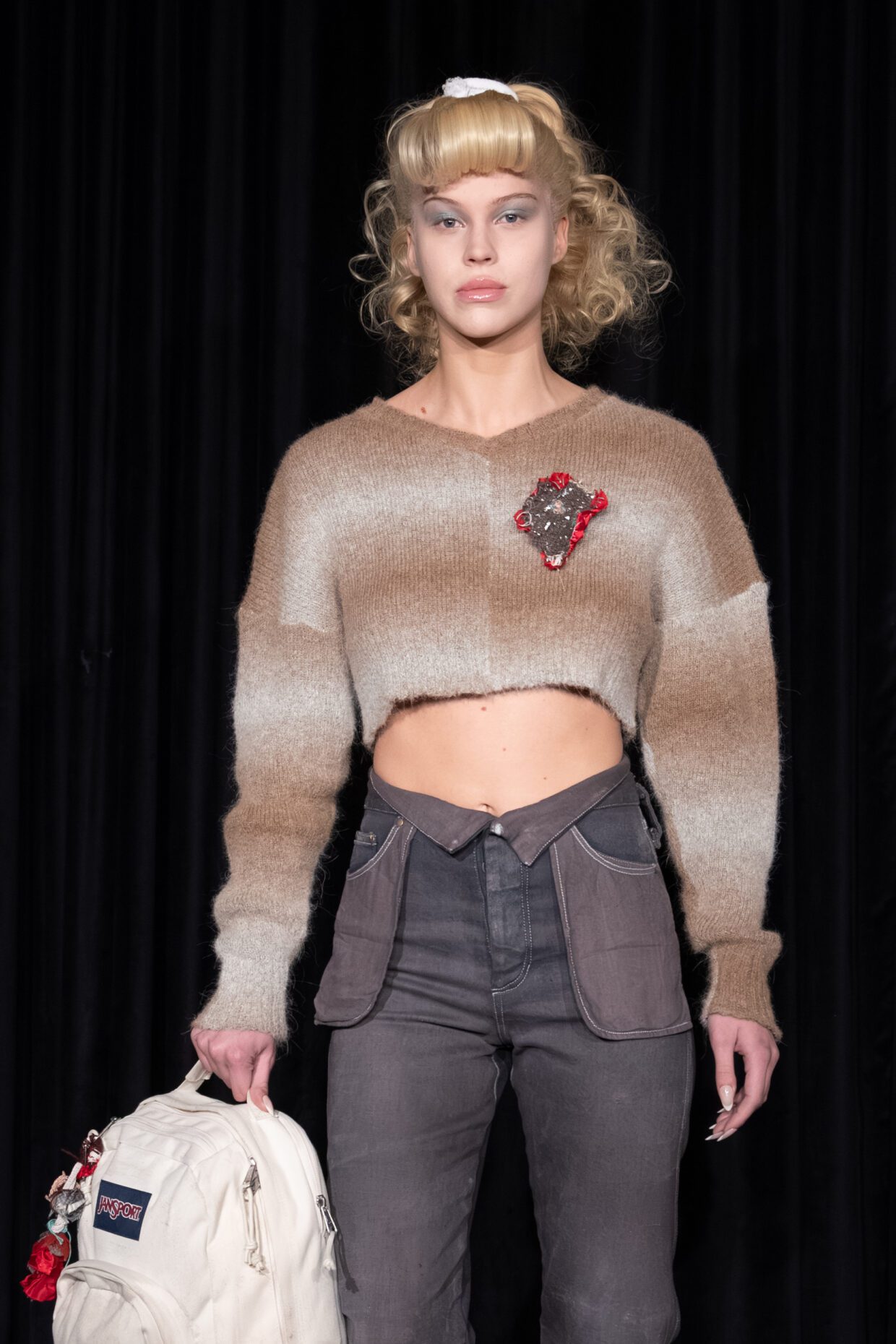 Davey Matthew: The hair was directly inspired by the collection and Gabe Gordon’s love and ability to pull inspiration from cult classic horror movies like “The Shining.” This collection also pulled inspiration from the ice skating world, and you can see it all in the hair story. It’s imaginative, fun, and a break from the “clean girl” slick backs. We added a lot of texture, volume, and incorporated an ode to Tonya Harding with bangs worn on select few models.