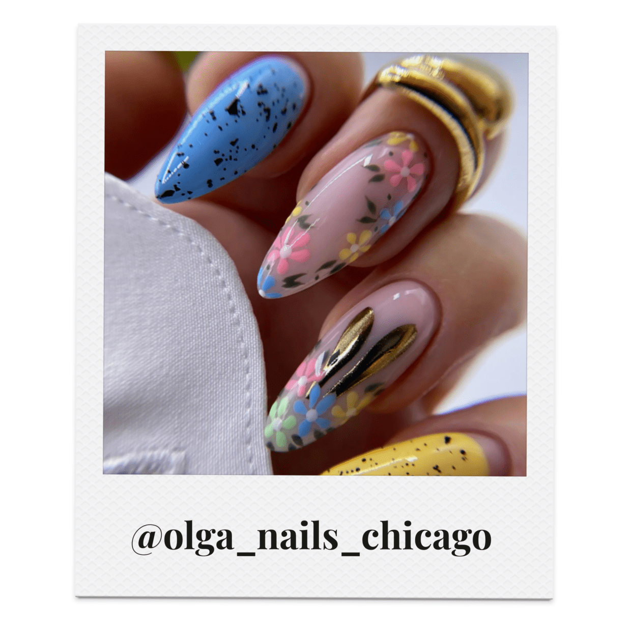 The design by @olga_nails_chicago showcases how grouping small florals together creates a refined spring manicure. She also incorporates speckled egg accents, a clever detail that connects the look directly to Easter while remaining adaptable in any pastel or spring color palette your client prefers.