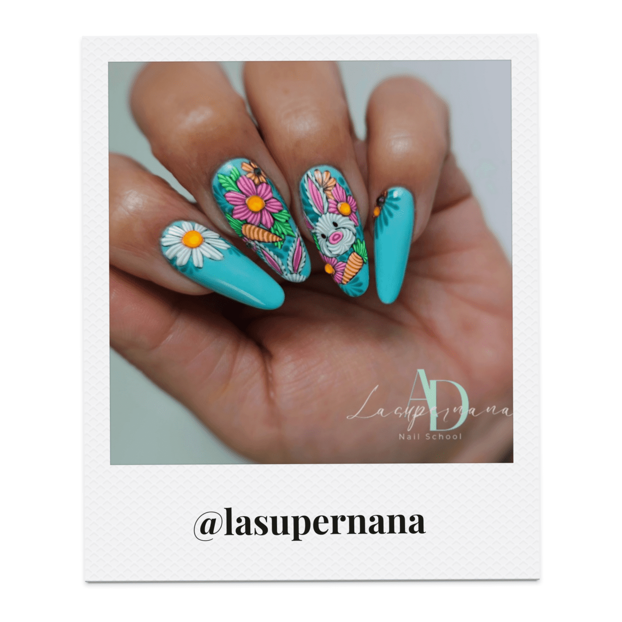For artists looking to introduce texture, techniques like sugaring can transform even the simplest floral design. In the hidden bunny look by @sweet.brush.co, sugared petals add dimension and softness that enhances the seasonal theme.