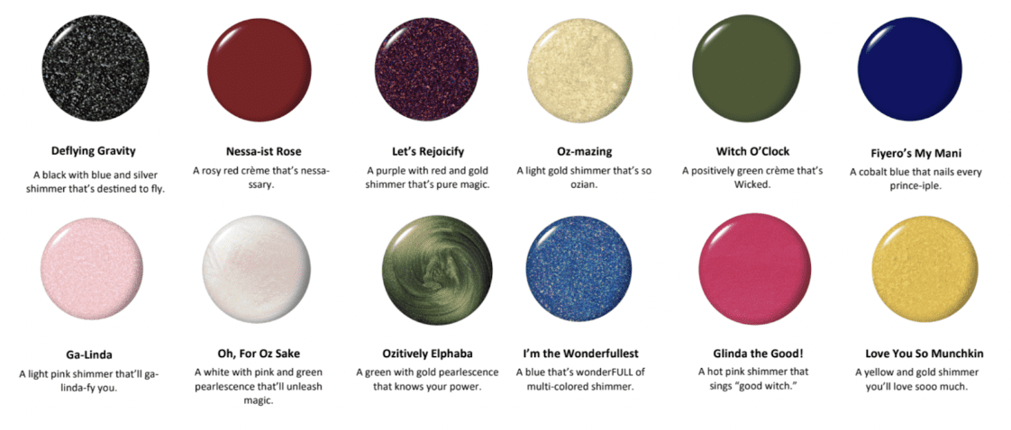Shade names are inspired by the characters and world of Oz. Names leverage catchphrases from Elphaba, Glinda, and themes from Oz, and also have a touch of Ozian language like “thrillify” and “oz-mazing.”
