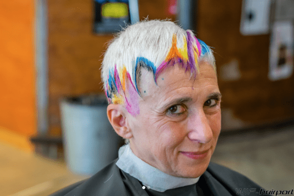Lisbon-based salon WIP-Hairport posted a pic on their IG of a woman rockin’ a pixie with jagged bangs and a variety of neon colors painted along their edges. The geometric design continues along the back of her platinum hair with squiggly black lines at various points on her head creating a design we never knew we were missing. The style is pretty out there, but we’re diggin’ the creativity.