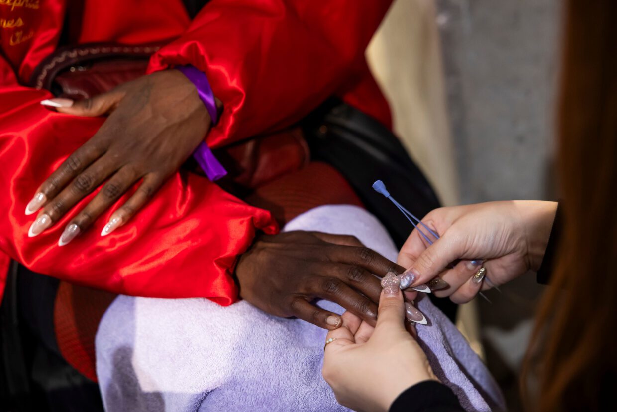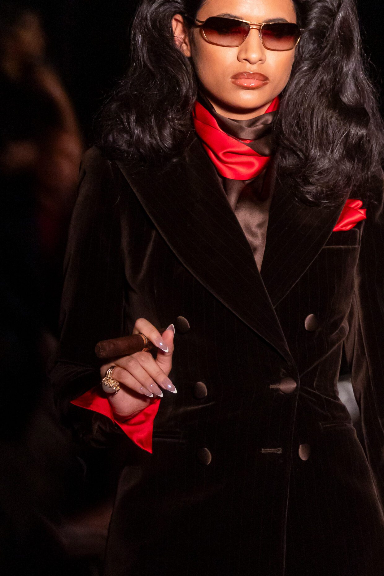 On the nail design, lead Manicurist Gina Edwards tells The Tease, “You can’t go wrong with a classic French elevated with a high-shine, chrome finish that’s continuing to trend. The stiletto shape of the nails echoes the precision and structure seen throughout the collection.”