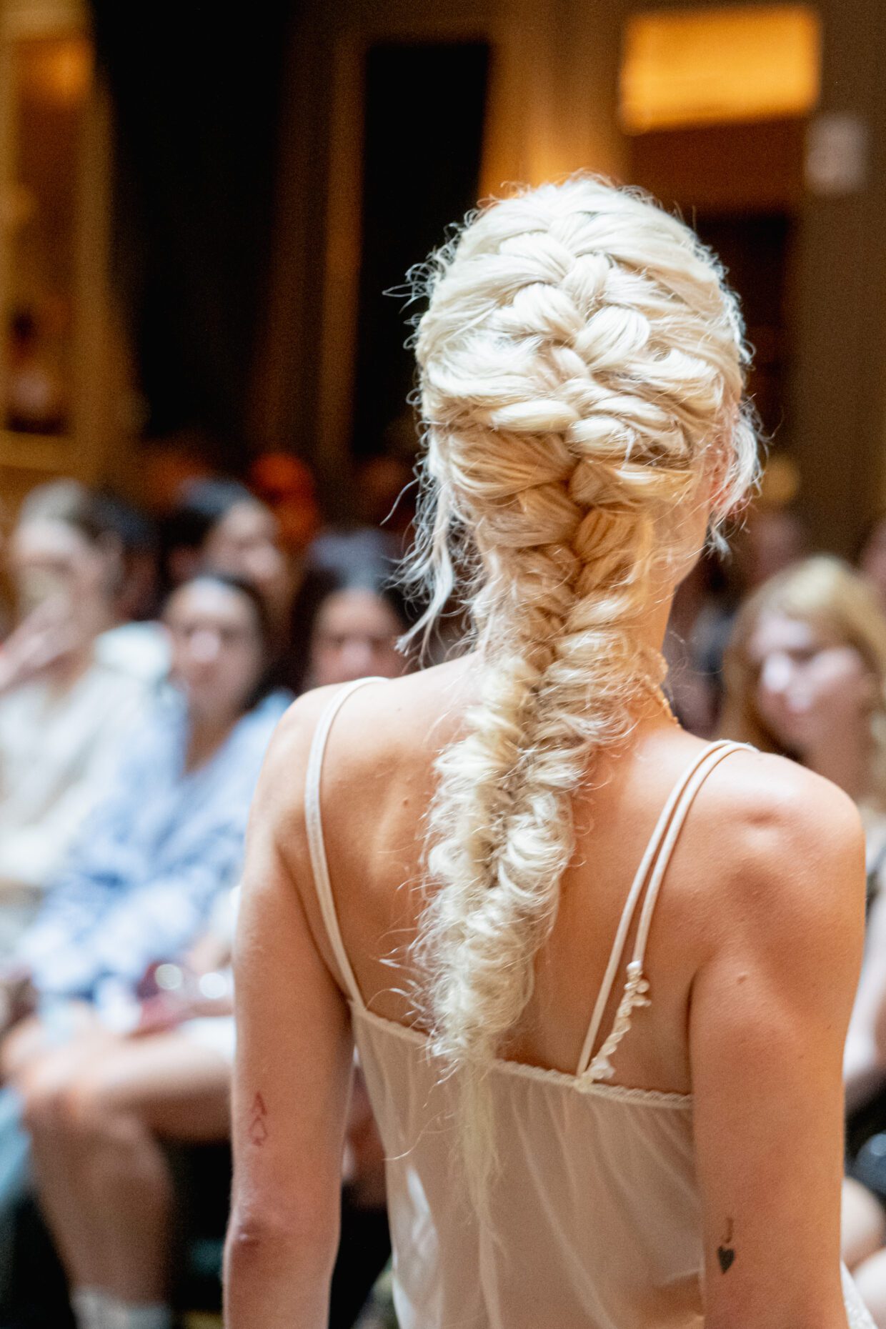 - Beginning at the crown, braid hair into a loose fishtail braid, securing ends with an elastic.