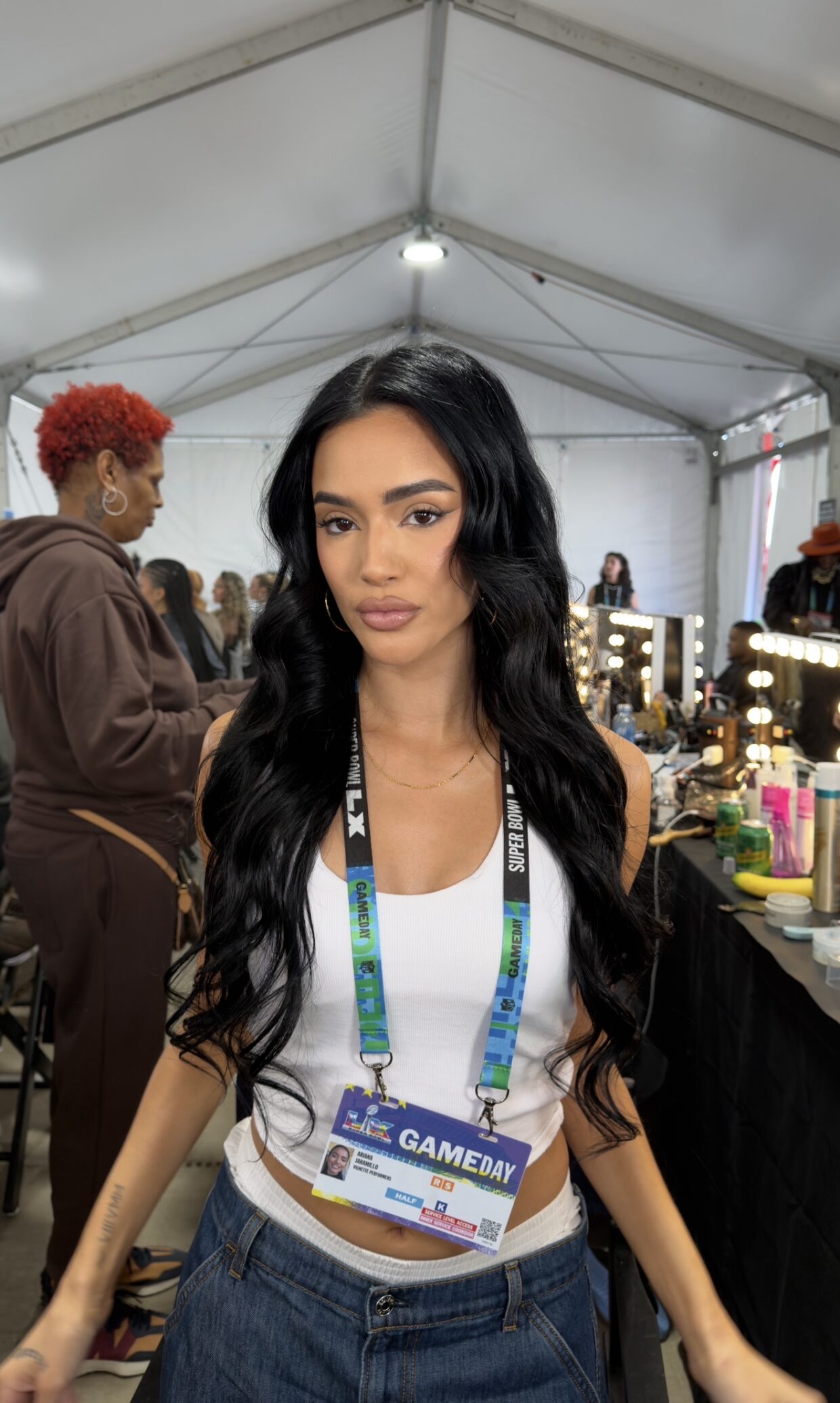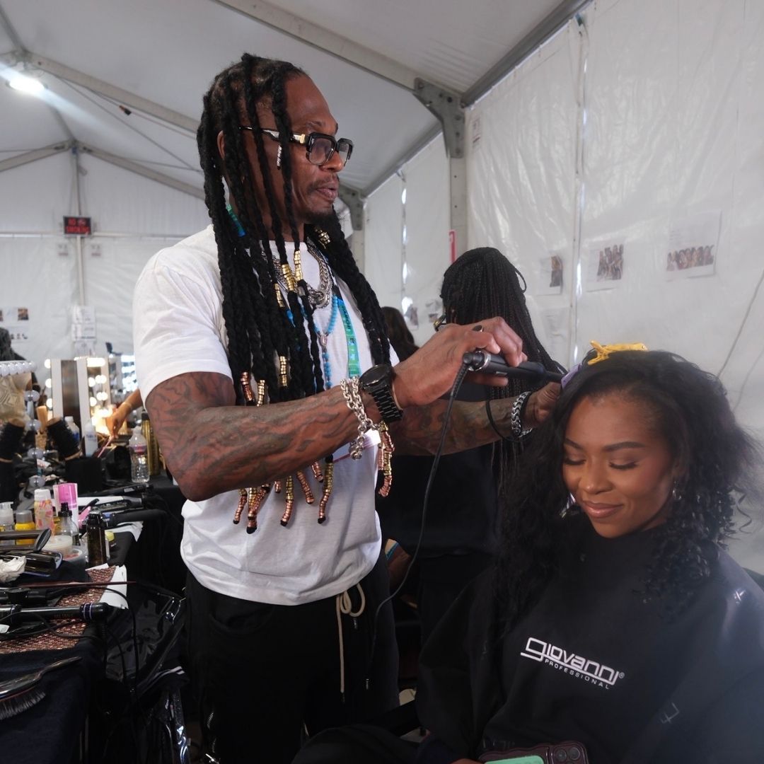 Going into the halftime show, I knew we’d be managing close to 300 performers. I gladly accepted the role, and together Mariah and I led the team and built a behind the scenes hair operation that ran like a well-oiled machine. Because most of the dancers had natural texture, we built the looks around their real hairstyles and curl patterns. We carried that through the whole group by recreating those textures on dancers who didn’t naturally have curls. That meant a lot of [curling] with ghd curling wands, and in a few cases, using wigs that we custom-curled to match the overall aesthetic of the team. It kept everything cohesive while still feeling natural.