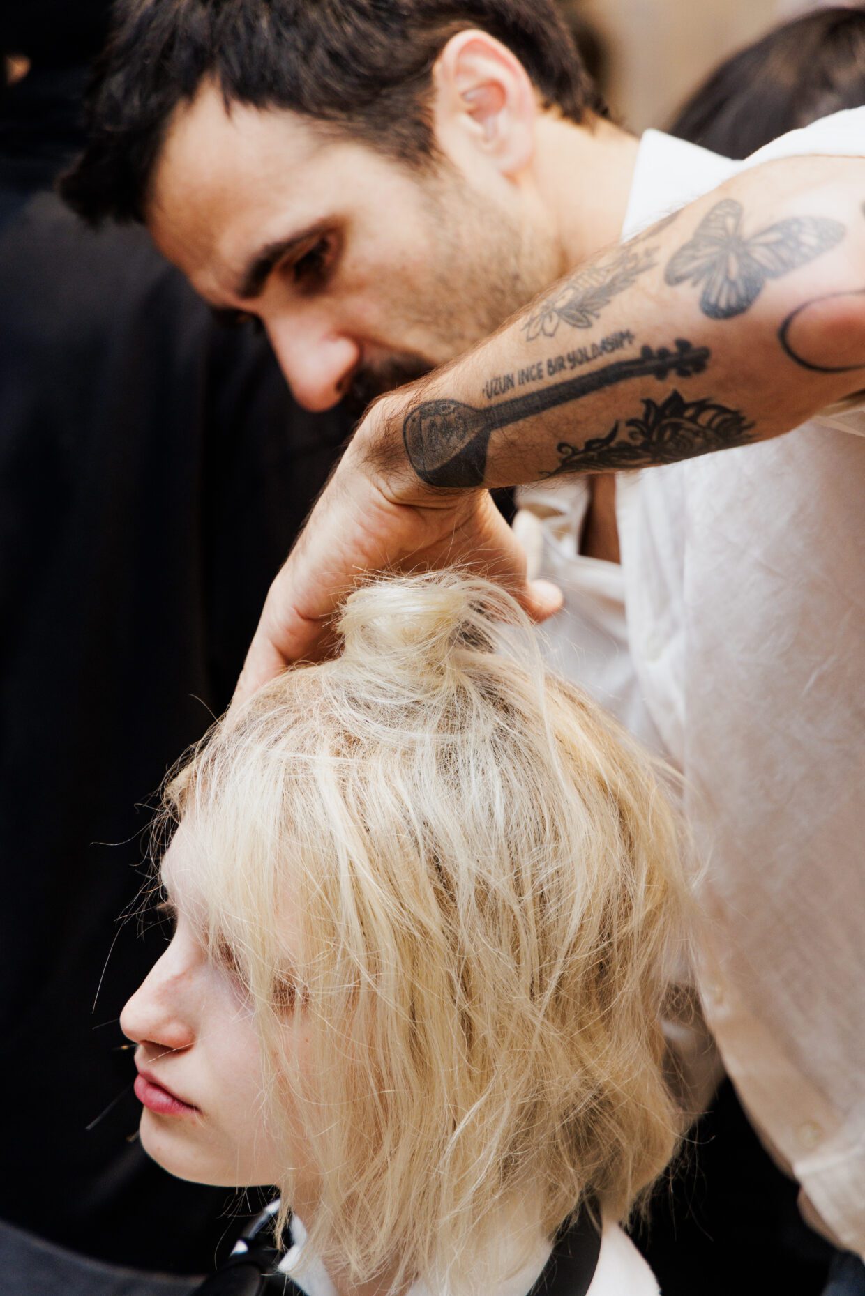 - “The second look is The Swirl, which was inspired by my son. He recently started wearing hats because it’s been cold outside, and at the end of the day when he takes his hat off his hair forms this natural swirl that looks almost backcombed and twisted in certain areas. It is slightly chaotic but beautiful. To recreate that feeling I started with Prêt-à-powder Dry Shampoo Powder to create grip and root lift.