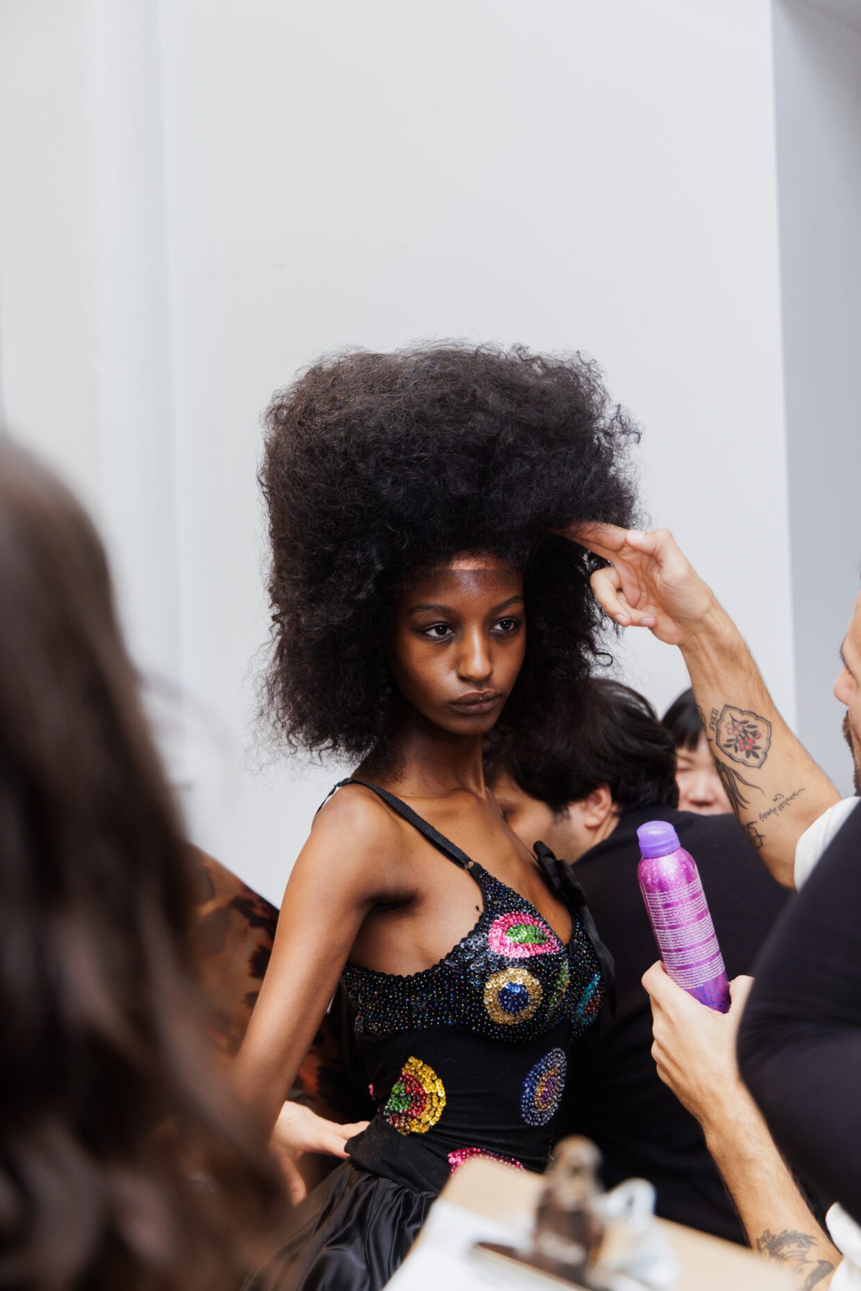 - “The first look is all about drama and height. We placed a large teased wig directly on top of the model’s natural hair to exaggerate volume, then added colored extensions to elongate the silhouette while keeping it slightly shorter in the back for shape and proportion.
