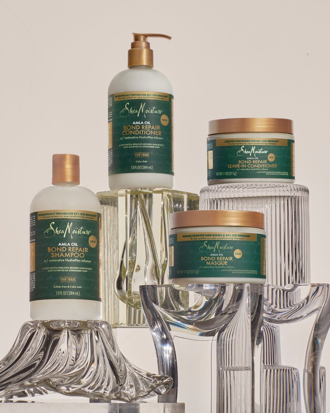 The 4-step Bond Repair system features: Amla Oil Bond Repair Shampoo, Amla Oil Bond Repair Conditioner, Amla Oil Bond Repair Masque, and Amla Oil Bond Repair Leave-in. Additional products in the collection include Amla Oil Bonding Oil, which provides both heat protection and moisture, and the Minoxidil topical solution 2% for women that reactivates hair follicles to stimulate regrowth.