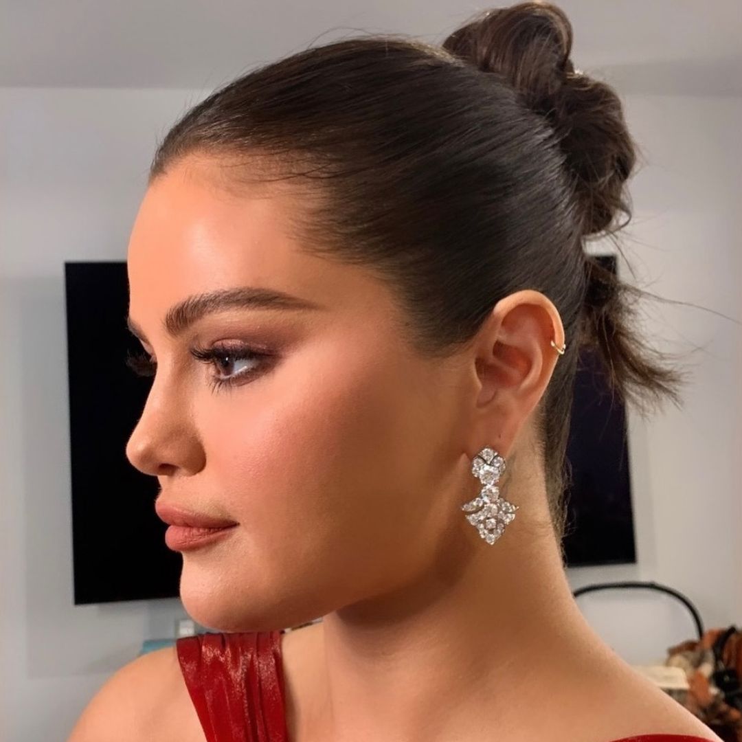 It looks like Selena Gomez ditched the honey-blonde highlights she was recently rocking and returned to her natural, deep brown. At last night’s Golden Globes, the nominee teamed up again with celebrity hairstylist Marissa Marino for a statement-making top knot.