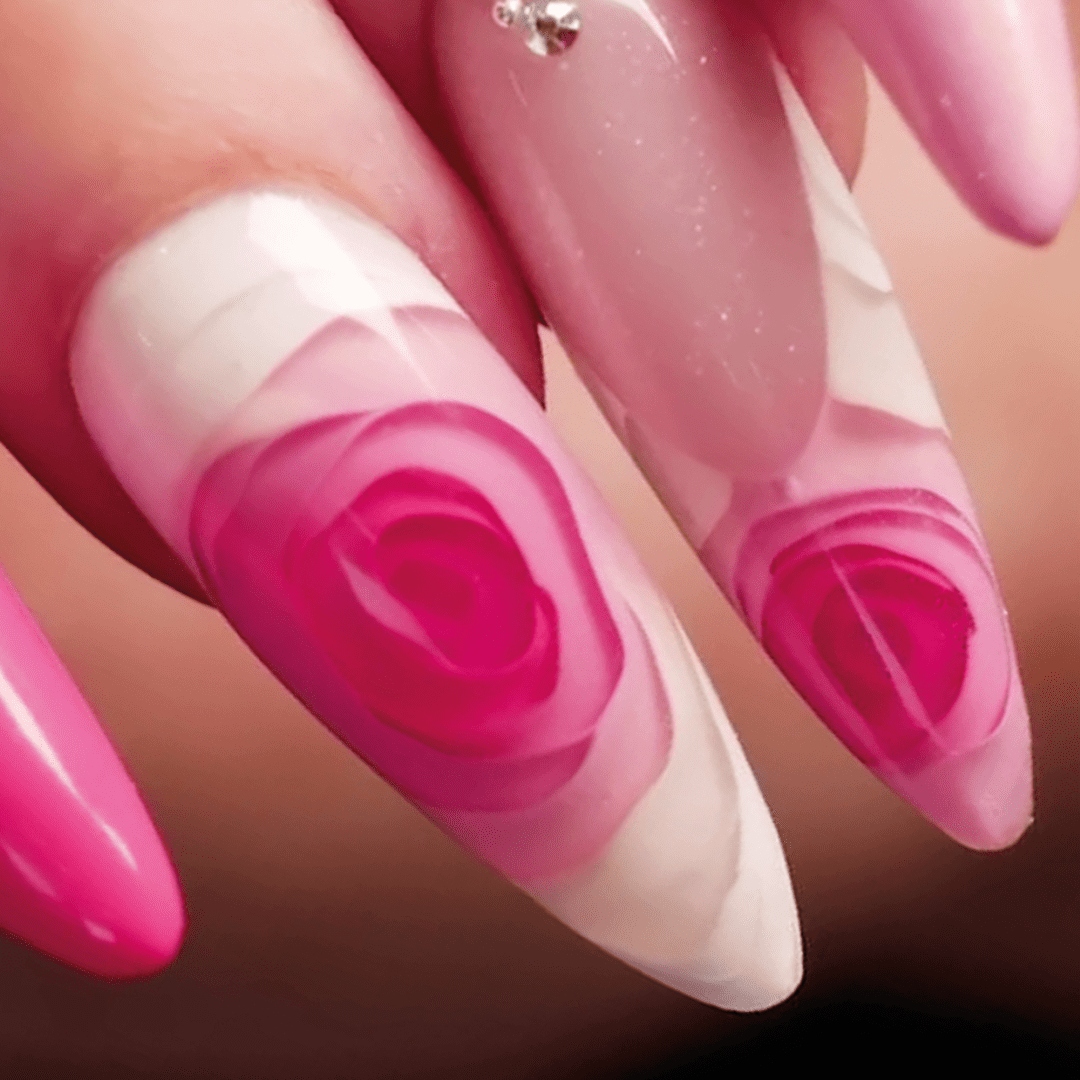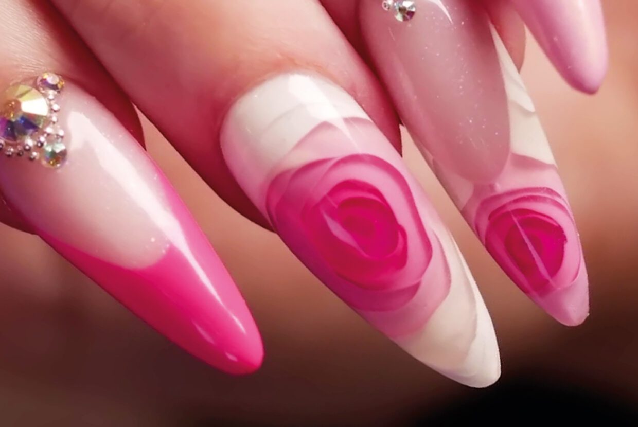 Another showstopper is Kirsty Meakin’s inlaid rose blossom. The delicate unfolding petals appear embedded beneath the nail’s surface, delivering a sleek, glass-like finish that’s pure elegance.