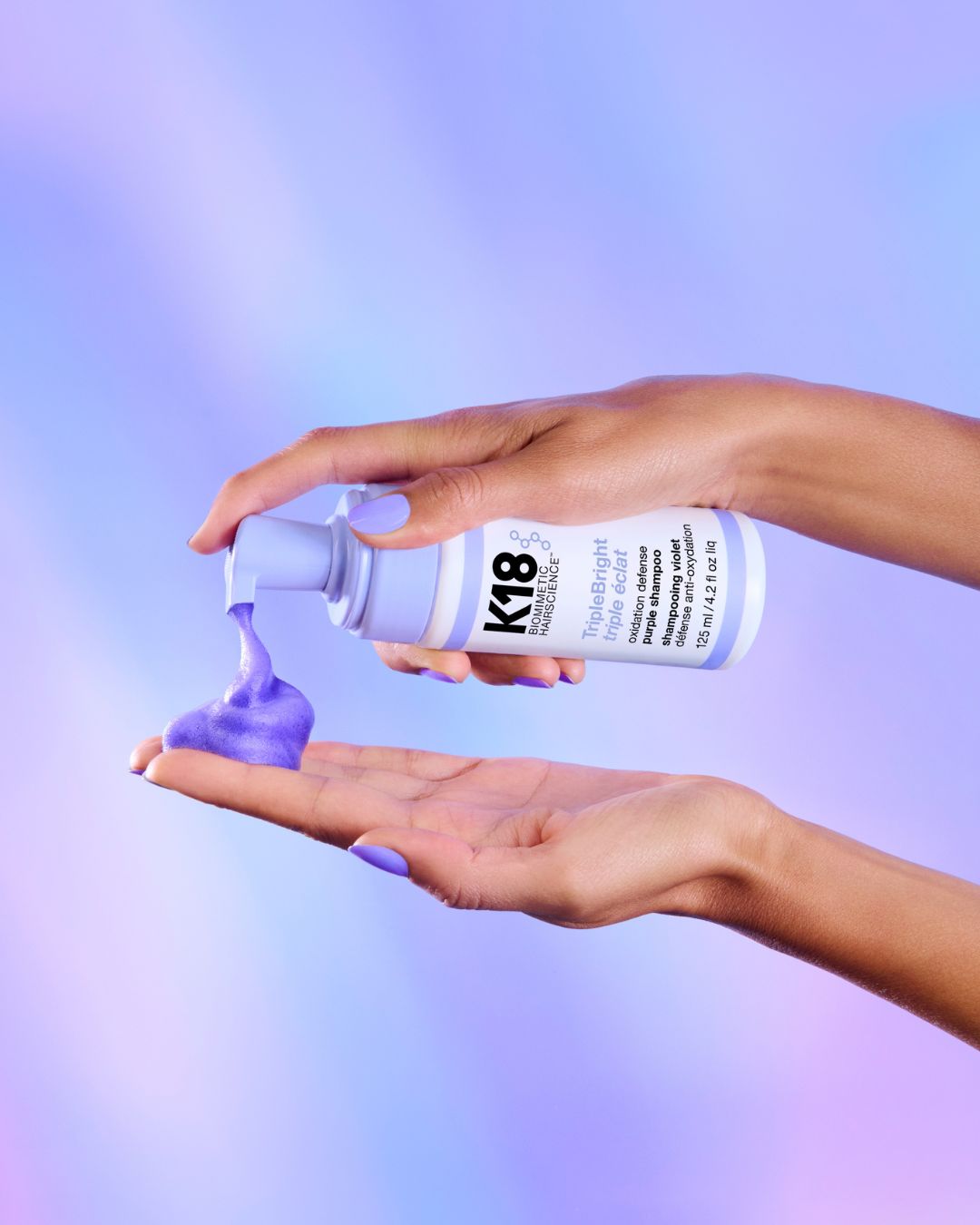 K18 is set to disrupt purple shampoo with a next-generation formula, its all-new TripleBright™ Oxidation Defense Purple Shampoo. Unlike traditional purple shampoos, TripleBright comes in a light, airy foam that makes toning feel effortless.